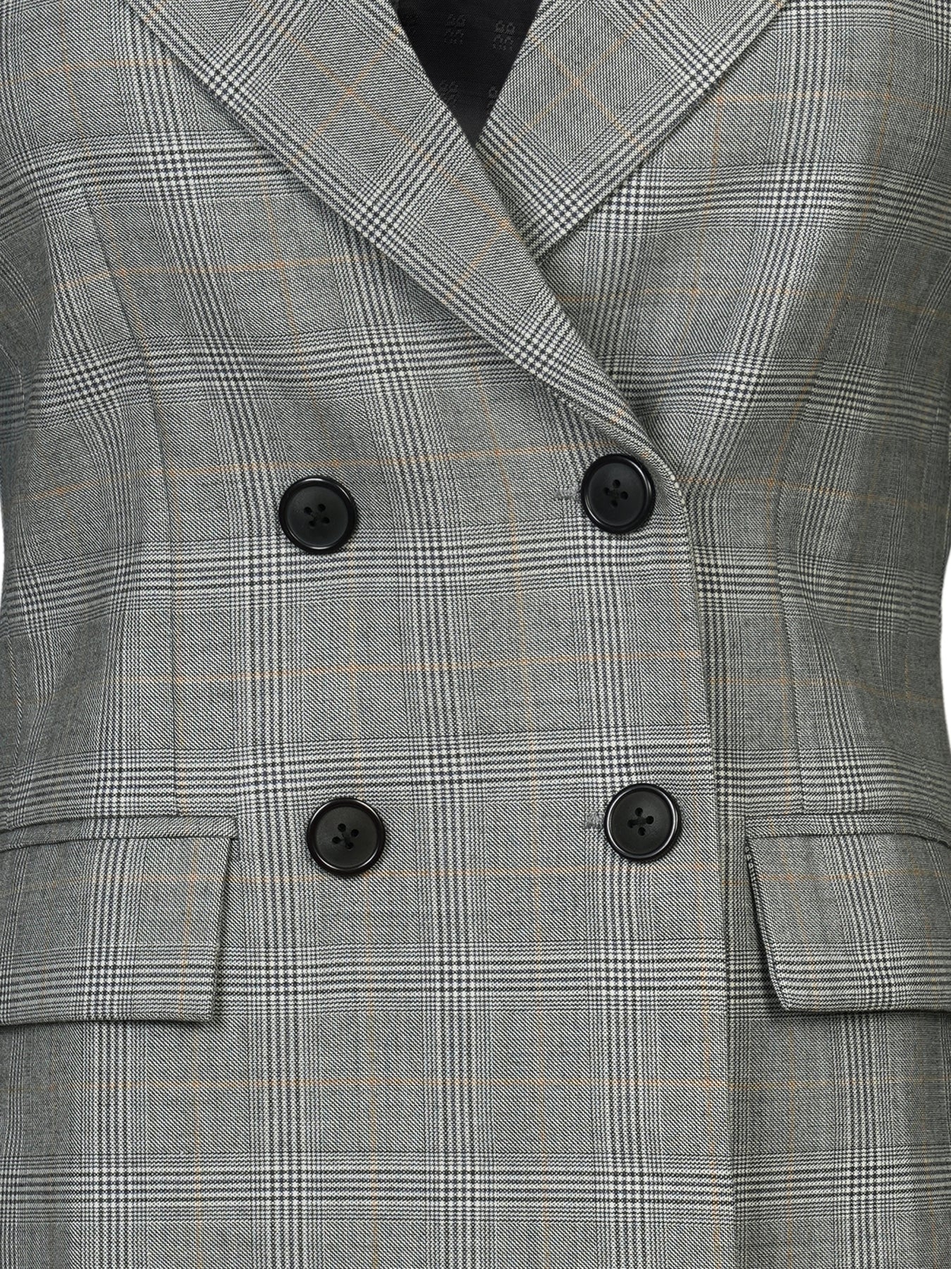 This grey-checked double-breasted blazer is designed with high-quality fabrics for both formal and casual occasions. It is a slim-fit blazer for women, featuring lapel collars and long sleeves with one button at the end of each sleeve. The double-breasted blazer has four buttons on the front, two of which are functional. The checked blazer includes structured shoulder padding and front pockets with flaps.