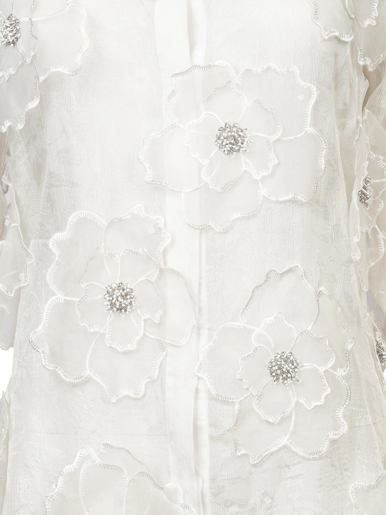 The White 3D Floral Crystal Embellished Pure Chiffon Shirt is a celebration of delicate artistry and refined style. Designed for the woman who values detail, grace, and quiet luxury, this piece brings together modern sophistication with handcrafted charm.